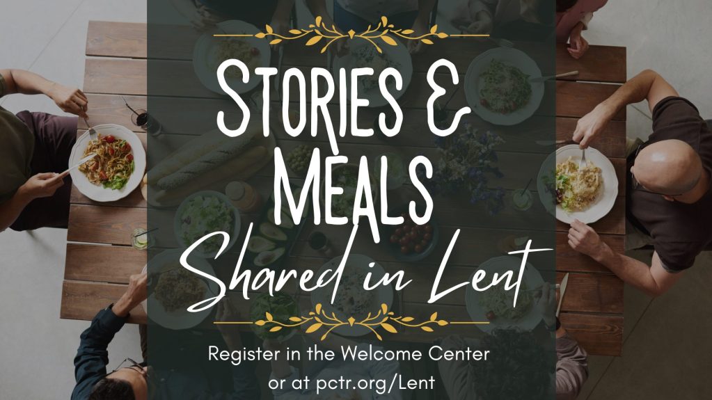 Pull up a seat around a table this Lent for Stories and Meals. This is an unique opportunity to get to know others at PCTR through a pot-luck style dinner among 6 or more. You can volunteer to be a Host and open your home, or be a Guest and bring a portion of the meal. Sign-up now as groups will be forming soon. Gatherings will take place during Lent. Stop by the Welcome Center for more info or to register or visit pctr.org/lent.