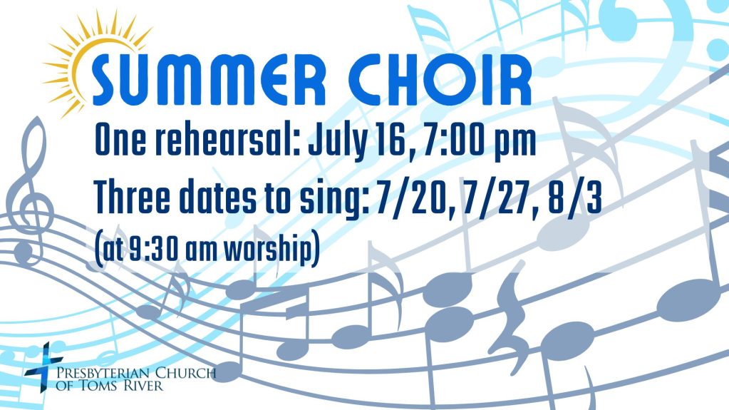 Whether you sing every week in a choir or only sing in the shower, Summer Choir is for you! We will hold one rehearsal on July 16 and have three opportunities to sing. Music will be accessible and fun to sing. (We’re singing in worship on July 20, July 27 and August 3 at the 9:30 am worship service.)