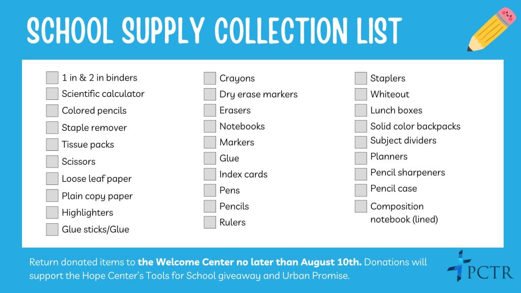 We know you’re enjoying your summer, but it’s time to talk about school supplies! We’re collecting donations starting July 20-August 10th. Your contributions will be distributed to students who need them through our mission partners at the Hope Center and Urban Promise. Grab a list of items we’re collecting in the Welcome Center or at pctr.org/now