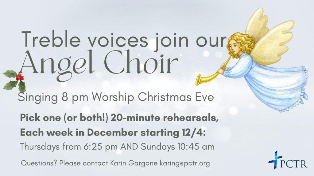 Singers with treble voices are invited to join this special choir! Come to one or both 20-minute weekly rehearsals throughout December (Thursdays at 6:25 pm and/or Sundays at 10:45 am) & then sing at the 8 pm Christmas Eve service. Meet us in the large rehearsal room for practices!