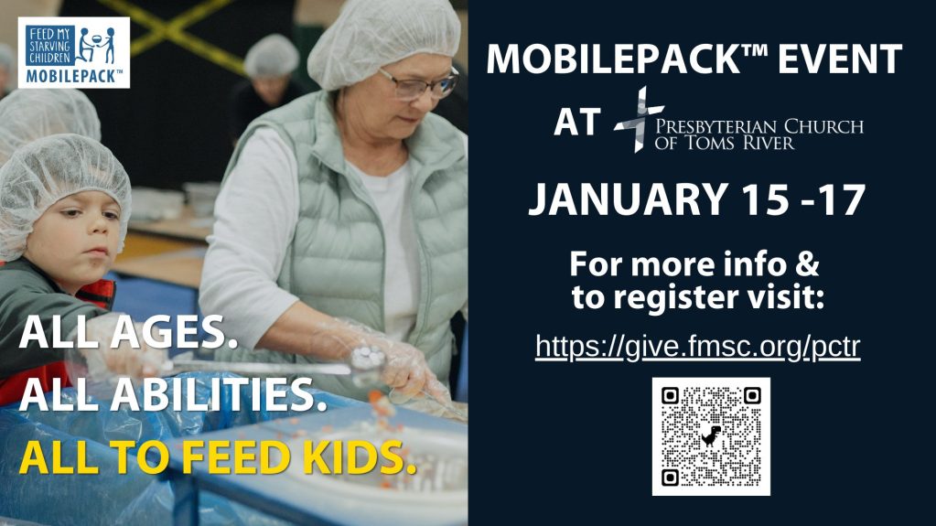 This January we will have the opportunity to prep and pack over 100,000 meals with our partners, Feed My Starving Children (FMSC) MobilePack, and we need YOUR help to do it! FMSC will provide all the supplies. We’re mustering up the manpower! These meals will be shipped around the globe to children who need it. Register online at https://give.fmsc.org/pctr. Sign-up for one or more time blocks in the three day span. Open to everyone aged 5 and up.